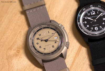 Erhältlich in Sand, Blau, Schwarz oder Grün, mit passenden Zifferblättern, hat der Khaki Pioneer Aluminium einen 41 mm Gehäusedurchmesser, trägt aber aufgrund der breiten Lünette und des kleinen Zifferblattdurchmessers kleiner.